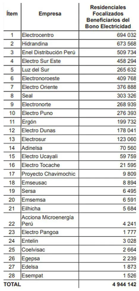 El subsidio será por S/ 160 para cubrir los pagos por recibos de luz. Mediante la Resolución N° 021-2020-OS/GRT, publicado este sábado 25 de Julio en El Peruano, se aprobó la lista de beneficiarios del subsidio Bono Electricidad, correspondientes a las empresas de distribución eléctrica y número de usuarios de cada una de ellas que se indica a continuación: