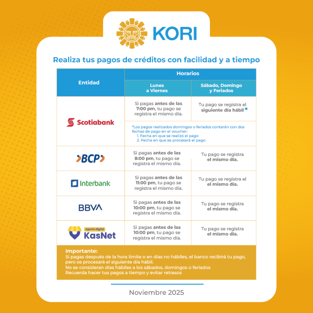 ¡Realiza tus pagos de crédito grupal Sumaq Warmi con facilidad y a tiempo! En COOPAC Kori, queremos asegurarnos de que realizar tus pagos sea sencillo y sin complicaciones. Por eso, te recordamos los horarios clave de nuestros canales aliados para que puedas hacer tus pagos con tranquilidad y que se registren de manera oportuna. ¡Aquí te dejamos la información que necesitas saber!