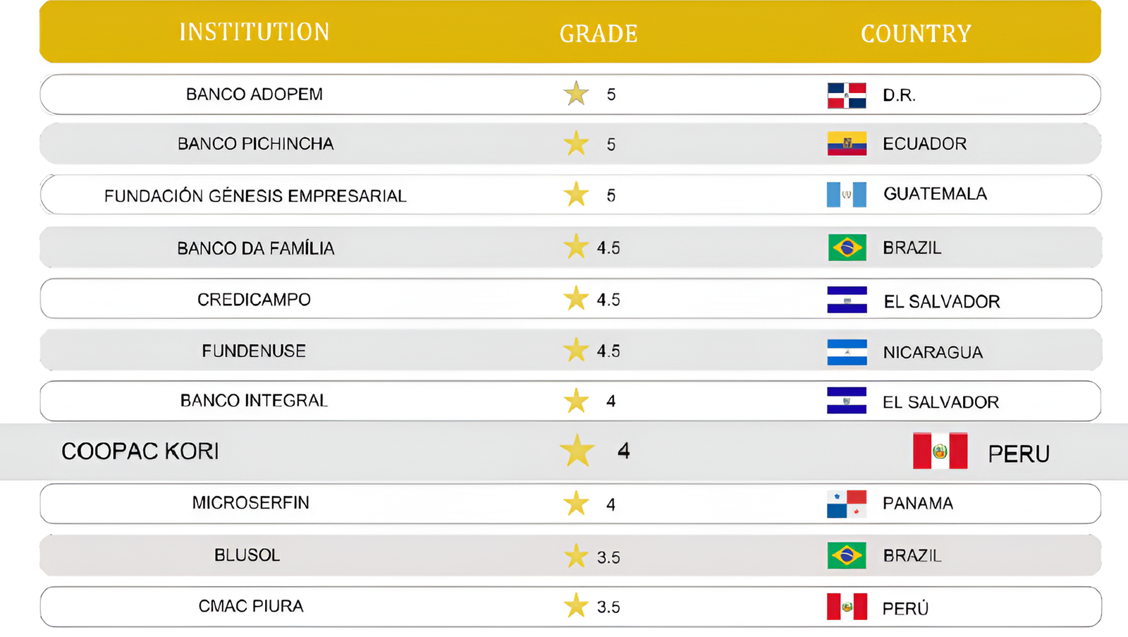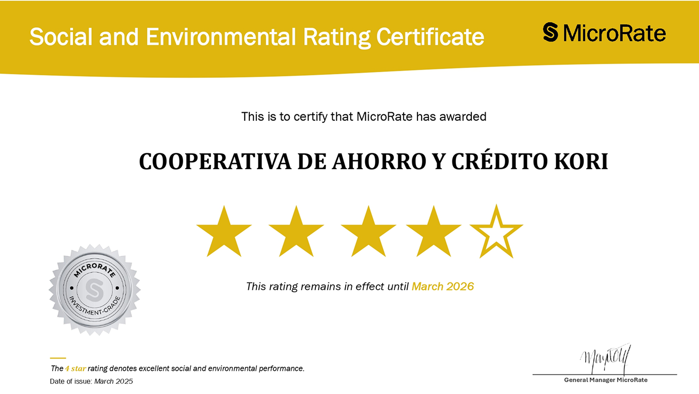 Contamos con certificación de MicroRate, que respalda nuestra solidez financiera y compromiso con la transparencia y el impacto social en el sector financiero.